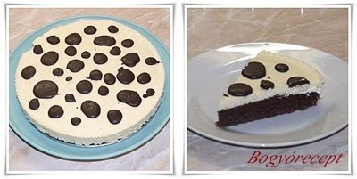 3, A díszítéshez olvasszuk meg az étcsokoládét és keverjük hozzá a tejszínt. Töltsük zacskóba, vágjuk le a sarkát, majd nyomjunk belőle pöttyöket a torta tetejére.