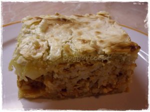 5, Egy tepsit vékonyan kiolajozunk és beleterítjük a káposztalevelek felét. A leveleken eloszlatjuk a tölteléket, majd befedjük a maradék levéllel.